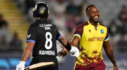 The Black Caps struck twice in the power play, with Brandon King and Alick Athanaze falling to Jacob Duffy and Kyle Jamieson, respectively, leaving the West Indies at 32/2 after six overs.